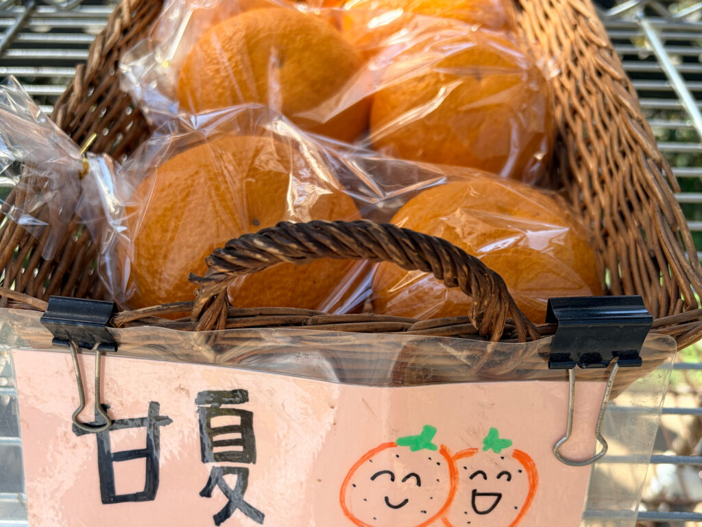 イデファームの家の前にある「無人販売所」にも、春を告げる爽やかな「黄色い果実」が並び始めました。そう、春の香り弾ける「甘夏」です。