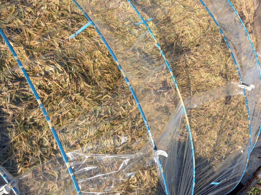 ここに、お水をたーーっぷりと回しかけて稲藁にお水が全体に回るようにしっかりと混ぜ合わせ、最後にビニールをすっぽりと被せたら、簡易ビニールハウス(トンネル)の完成です!