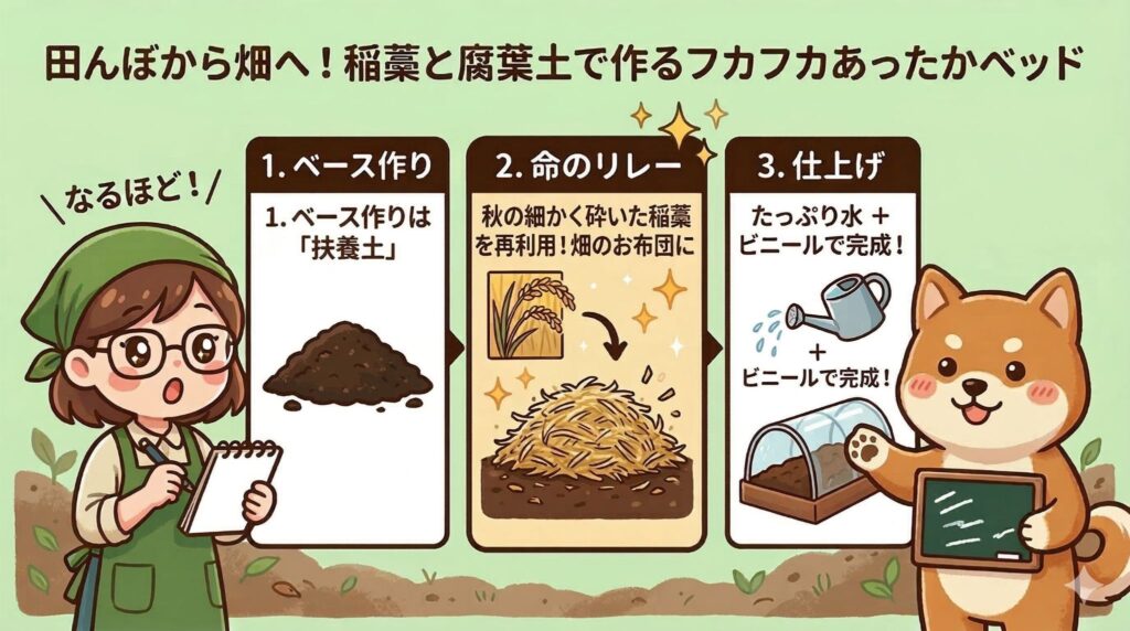 トラクターでの田おこしに続き、畑では秋の大人気野菜「さつまいも」の準備も始まりました! さつまいもは、種ではなく「苗(ツル)」を植えて育てるのですが、その苗を育てるための「ベッド(苗床)」作りが、とっても奥深くて面白いんです。